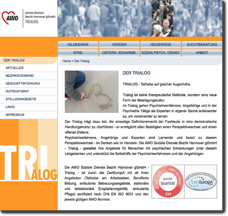 Trialog ist keine therapeutische Methode, sondern eine neue Form der Beteiligungskultur. Im Trialog gehen Psychiatrieerfahrene, Angehörige und in der Psychiatrie Tätige als Experten in eigener Sache aufeinander zu, um voneinander zu lernen. Der Trialog trägt dazu bei, die einseitige Definitionsmacht der Fachleute in eine demokratische Handlungstruktur zu überführen - er ermöglicht einen Perspektivwechsel und einen offenen Diskurs