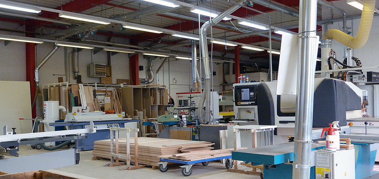 Die Tischlerei ist mit größeren Maschinen ausgestattet wie zum Beispiel Tischkreissäge, Plattensäge, Abrichte, Dickenhobel, stationäre Fräse.